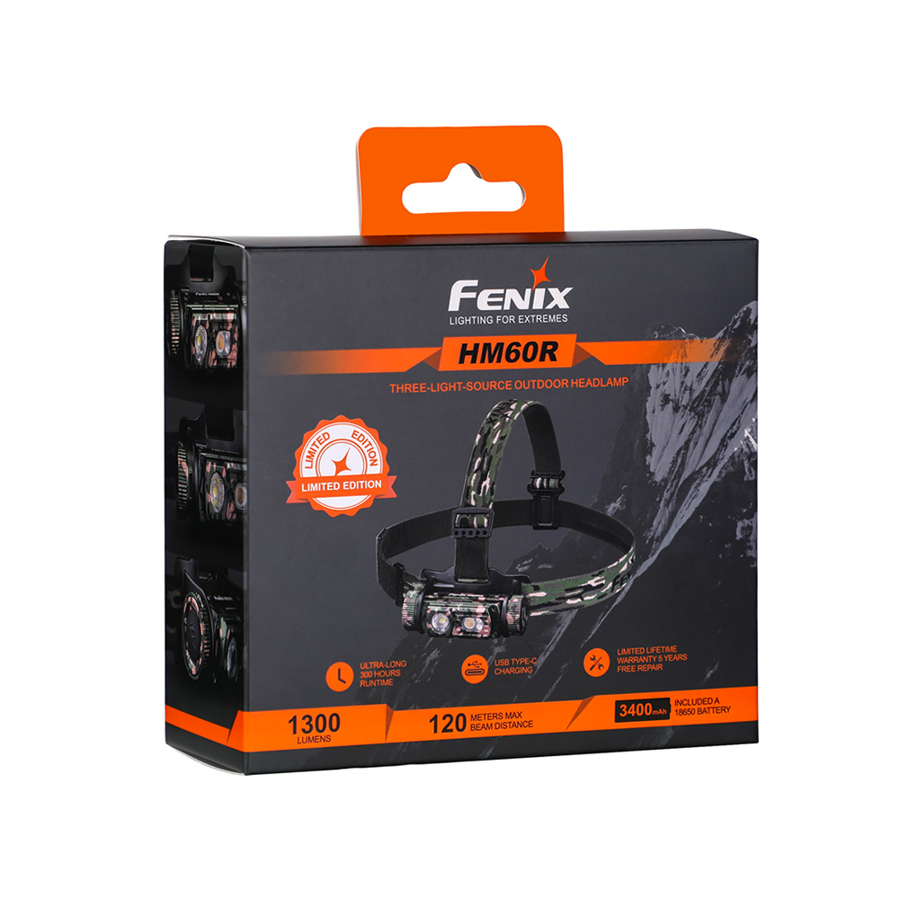 HM60R tuottaa jopa 1300 lumenin maksimivalotehon ja valaisee jopa 120 metriin. Fenixin patentoitu taajuuspohjainen valaistustekniikka tunnistaa käyttäjän liikkumisrytmin ja säätää kirkkautta automaattisesti etenemisnopeuden mukaan. Kolme valaisulähdettä (kohdevalo, lähivalo ja punavalo) takaavat optimaalisen näkyvyyden niin poluille, leirille kuin lähitöihin.