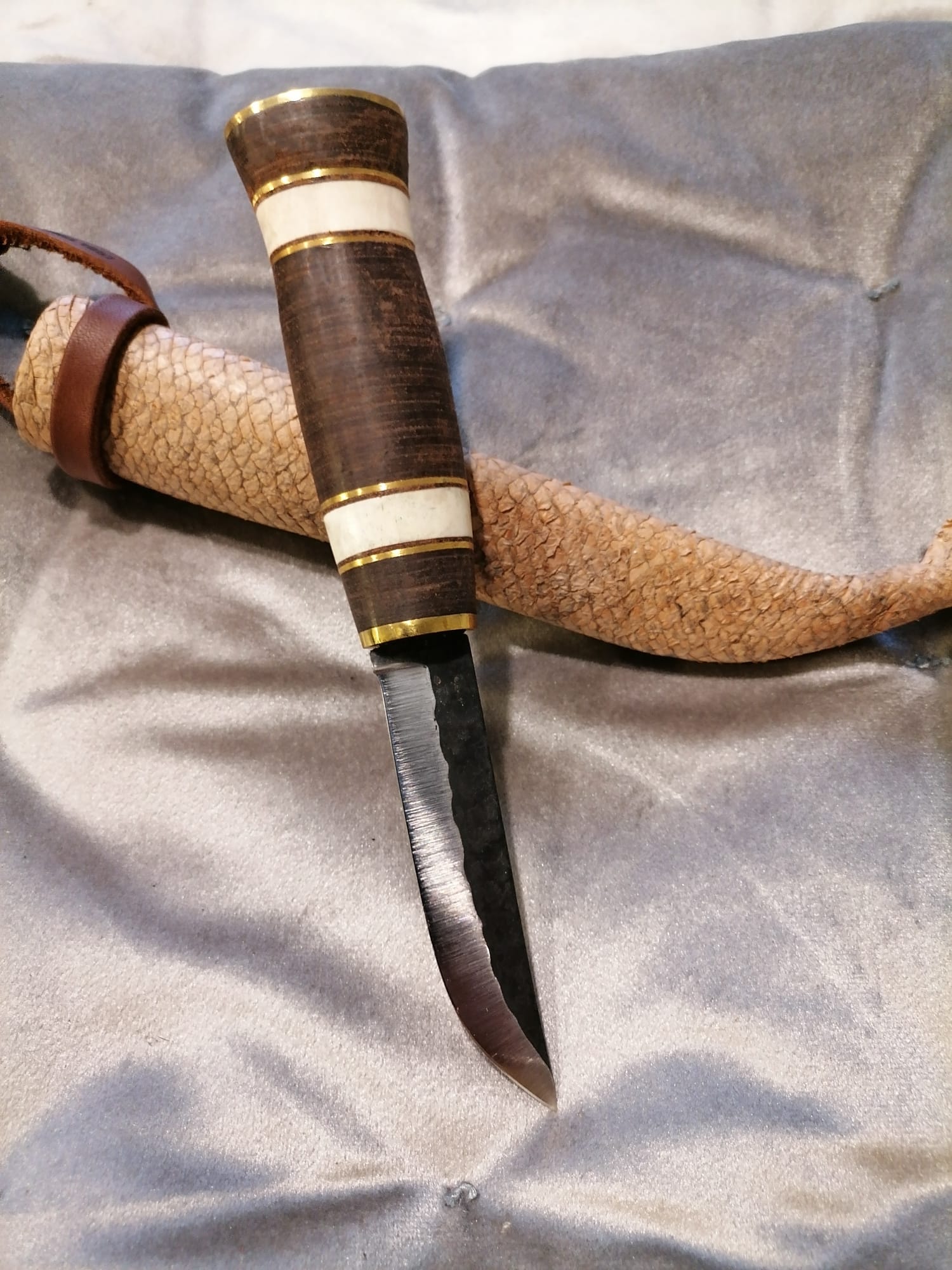 Puukossa on Laurin metallin hiiliteräs terä, messinki helat, naudannahka kahva messinki ja hirvensarvi tehosteilla.
